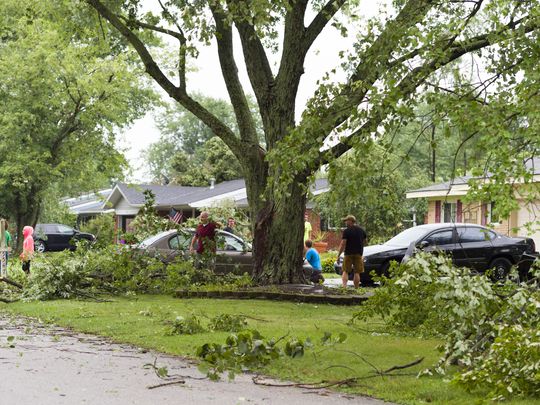 Photo by Doug McSchooler/For IndyStar “Several trees in a neighborhood near County Road 550 East and Hammon Drive, near Brownsburg, sustained significant damage Monday, Aug. 15, 2016. The National Weather Service confirmed that at least one tornado touched down in Hendricks County.”