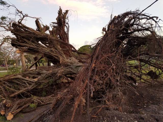 “They let me know that we had an issue,” said Nash, who was right there on Plover with his crew, chainsaw in his hand cutting away. “We were out here within 20 minutes, myself, my operations superintendent with a backhoe and immediately cleared some roads off North Royal Poinciana and Lenape. At that time, though, we had to suspend operations until we could get some daylight because there were too many downed power lines and we weren’t sure what was live. All hands on deck, got everyone out here clearing.”