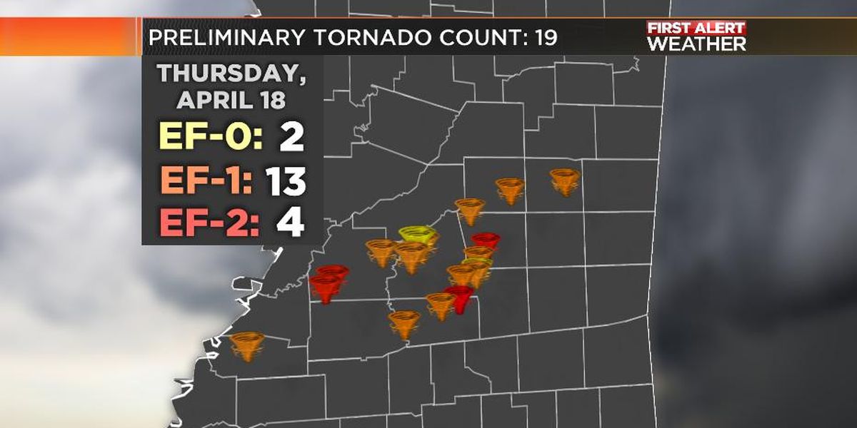 Thursday’s tornado count up to 19 as NWS surveys continue across central Mississippi